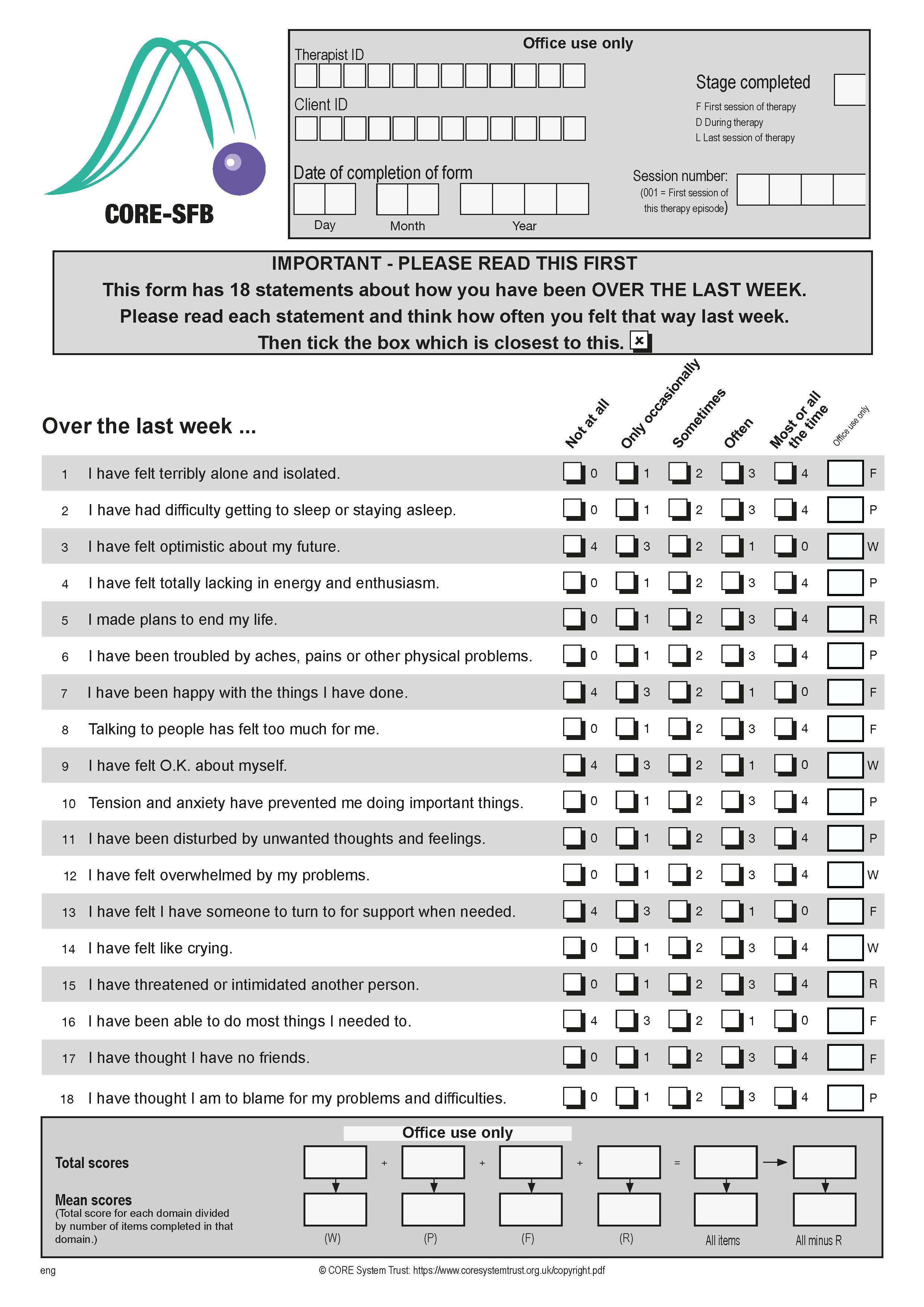 This is a new one so it’s hardly “frequentely asked” but I guess it may recur. Someone Emailed me in some anxiety having only a week to go to submit a thesis which used the GP-CORE (great, always so good to see CORE used sensibly outside the “clinical” realm). The university regulations required that the measure be included as an appendix and embedding the PDF wasn’t working. So I’ve made up images of all the English language forms. I’ve made them up in jpeg, TIFF and png formats but, unless it’s the only format your wordprocessor or typesetting system can handle, I’d avoid that: the quality is poor and the file size is large. If you need images for a translation, contact me.